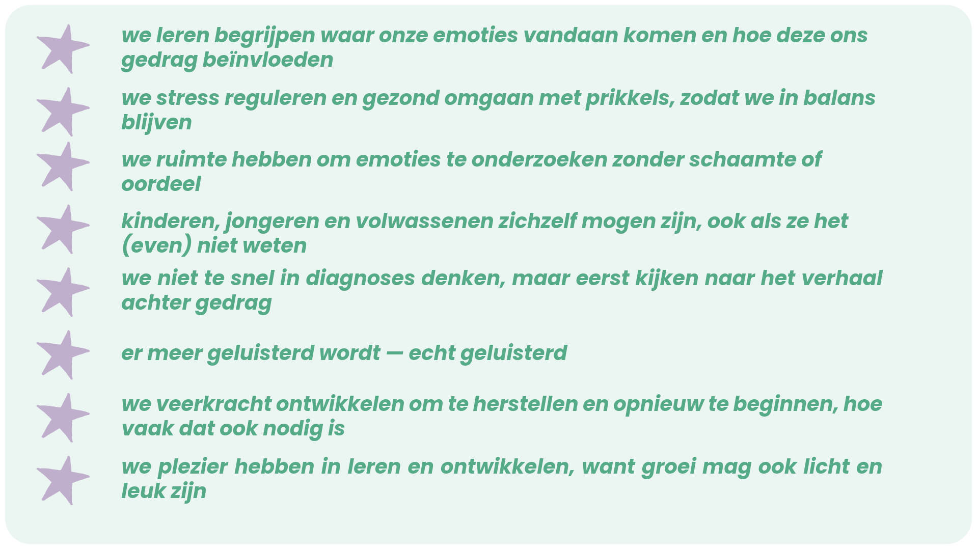 Onze eigen ervaringen hebben ons geleerd dat er achter gedrag altijd een verhaal schuilgaat. Een gevoel. Een mens. En precies dat willen wij blijven uitdragen in het onderwijs, de kinderopvang, de jeugdzorg én in gezinnen.
